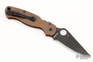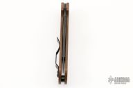 This Paramilitary 2 Linerlock Folder has a black clip point S45VN blade with thumb hole and notched thumbrest. The handle has copper Flytanium scales, stainless steel liners and a custom titanium tip up clip. Has some scratches and patina, otherwise good condition.