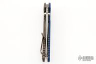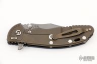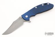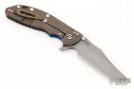This Bowie Ground XM-24 from Hinderer Knives features a working finished bowie blade with dual thumbstuds and notched thumbrest and flipper. The handle has a textured black/blue G-19 scale and battle bronze titanium frame over titanium barrel spacers, battle bronze filler tab and tip up clip, lockbar stabilizer.  Includes original box and extra hardware. Excellent condition.