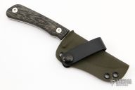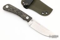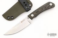 This BaseCamp by Rainier Knives features a stonewashed blade with notched thumbrest, 1/4" hex opening, .125" blade stock and 1.007" blade depth, full tang construction. The handle has black linen micarta scales. Comes with a kydex sheath. Excellent condition.