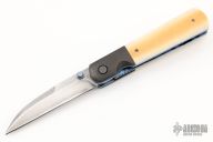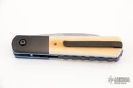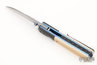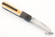 The Linerlock by Dewayne Chancellor features a Sole Authorship San Mai Damascus blade with an anodized titanium thumbstud. The handle has blackened titanium bolsters, backspacer and tip up clip with hidden screws, vintage Westinghouse paper micarta scales, anodized titanium liners. Rides on Teflon washers, nice detent, lockup and blade seating. Comes with COA. New from maker!