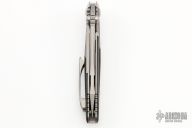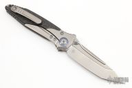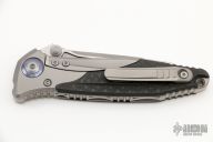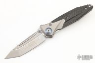 This Socom Bravo by Microtech is made in China by Rike Knife, it features a bead blasted blade, notched thumbrest, and dual thumbstuds. The handle has bead blasted titanium bolsters/liners, blue anodized pivot collars, carbon fiber scales. Tip up carry bead blasted titanium clip. Bead blasted titanium backspacer. Dated 05/2022 and s/n 1391. Comes with original box and papers. Excellent condition.