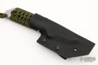 This knife by "SEB" (please let us know if you know who this is) features a bead blasted partially serrated blade with notched thumbrest, .246" blade stock and 1.315" blade depth, full tang construction with paracord wrapped handle. Comes with a kydex sheath with TekLok. Has some scuffs and spots, otherwise good condition. Comes with a zippered case.