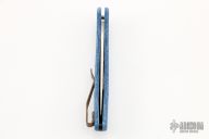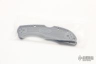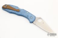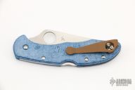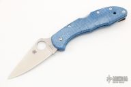This knife by Spyderco has a satin finished blade with thumbhole opener and notched thumbrest. The handle has blue a blue micarta frame with a tip up cerakote titanium clip.  Includes the original FRN scales and the original box.  Excellent Condition.