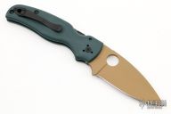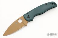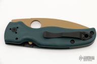 This Shaman Pln by Spyderco features an bronze spear point blade with notched thumb and finger rests, thumbhole. The handle has forrest green G-10 scales, inlaid stainless steel liners and a stonewashed stainless steel backspacer, 4-way reversible stainless steel clip, lanyard hole at the butt. Includes an extra set of titanium scales.  Excellent condition.