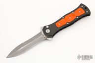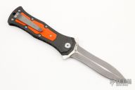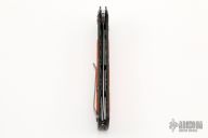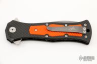 This Twist Tighe liner lock flipper by Brian Tighe features a satin finished spear point blade with dual thumb studs and flipper. The handle has a carbon fiber frame with orange G-10 inlays with a titanium tip up clip. Lanyard hole in pommel. Excellent Condition.