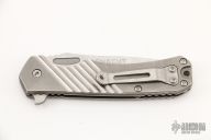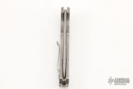 This knife by Freeman Outdoor Gear features a two-tone milled Magnacut blade with notched thumbrest and flipper. The handle has a milled and blasted titanium frame with matching tip up clip. Rides on bearings, nice detent, lockup and blade seating. Comes with a zippered case. Has some light scratches and spots on the blade, otherwise good condition.