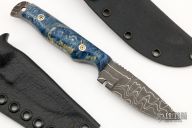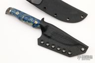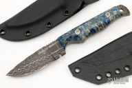 This Hunter by Dawson Select features a black Damascus Blade with notched thumb and finger rests, fileworked spine, .148" blade stock and .953" blade depth, full tang construction with burl scales. Comes with original kydex sheath and Armatus kydex sheath. Has a few marks on the blade, excellent condition otherwise.