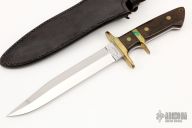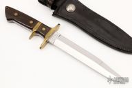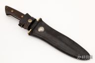 This Loveless Style Big Bear Sub-Hilt Fighter from Eugene & Sons features a mirror polished clip point blade with a sharpened top edge and a full tang construction.  .250"Blade Stock.  1.292" Blade Depth. The handle has a brass guard and micarta scales over red liners, lanyard tube in pommel. Includes a brown leather sheath.  Patina is visible on the guard otherwise the knife is in excellent condition.