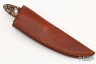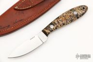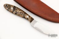 This Knife by George Herron features a mirror polished blade with .129" blade stock and .856" blade depth, full tapered tang construction. The handle has burl wood scales with stainless steel pins. Comes with a brown leather sheath. Has #2723 on the tang and sheath. Has some light staining on the blade, otherwise good condition.