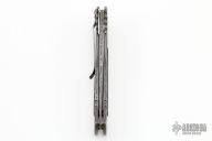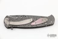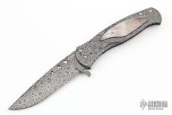This Assisted Open linerlock by Matthew Lerch features a Damascus blade with notched flipper tab. The handle has a Damascus frame with black lip pearl overlays. The handle has a tip down clip. Nice action and blade seating. Has a couple light scuffs, excellent condition.