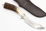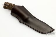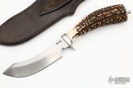 This Hunter by Jim Siska features a satin finished upswept blade with a hidden tang construction.  .186" Blade Stock.  1.069" Blade Depth.  The handle features a stainless steel guard/butt cap with a stag grip.  Includes a brown leather sheath, padded zippered case and a letter to the original owner.  Excellent Condition.