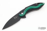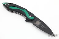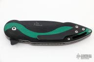 This Clandestine Glimpse linerlock flipper by Todd Begg features a black finished blade with flipper. The handle has g10 scales, cracked ice titanium liners, and tip up clip, black g10 backspacer. Includes IKBS (Ikoma-Korth Bearing System) for smooth and fast flipper opening that requires no wrist action. Nice blade seating, detent, and lockup. Comes with a nylon zippered case. Outstanding work. Excellent condition.