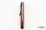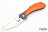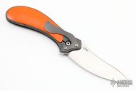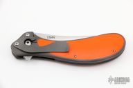 This Custom Assisted Opening Framelock Flipper by Ken Onion features a hand rub satin finished blade with flipper. The handle has a bead blast titanium frame with orange G-10 inlays, tip down titanium clip , black G-10 backspacer. Features Ken's Speed Safe mechanism. Notched thumbrest on frame. Nice detent, lockup, action and blade seating. Has a couple very light scuffs, otherwise excellent condition.