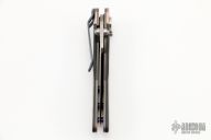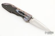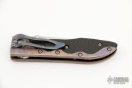 This Phantom auto by Allen Elishewitz features a tumble finished blade with dual thumbstuds and false top edge. Scales are anodized titanium and carbon fiber with titanium hardware. Has anodized titanium liners and purple standoffs. Clip is anodized titanium, tip down carry. This knife is numbered 16. Nice function and lockup. Has some light scratches, otherwise excellent condition.