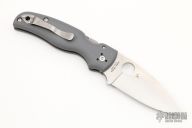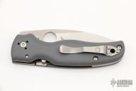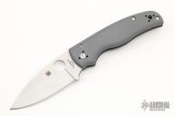 The new BladeOps Exclusive Spyderco Shaman features a gray G-10 handle, skeletonized stainless steel liners, a satin finshed leaf shaped ELMAX blade, and Spyderco's trademark round hole opening feature.