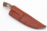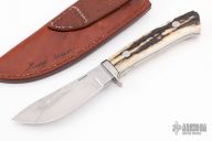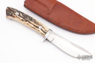 This Hunter by George Herron features a mirror polished blade with .191" blade stock and 1.121" blade depth, full tapered tang construction. The handle has a steel guard, stag scales with black liners. Marked 1726 on the bottom of the tang. Includes a brown leather sheath.  Light spotting is visible on the blade otherwise the knife is in Excellent condition.