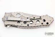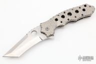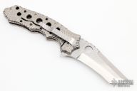 This Triumph flipper by Crawford Knives features a satin finish tanto recurve blade with jeweled flats and a jeweled titanium handle with file work along the edges and on blade spine. The stainless steel tip down clip and backspacer are also jeweled and fileworked. False top edge. Comfortable contoured handle. Smooth action with a nice detent, lockup and blade seating. Excellent work. comes with a zippered case. Has some light scuffs, excellent condition otherwise.