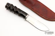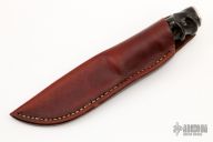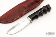 This knife by Bob Cumming features a satin finished blade with a partially sharpened top edge and hammered flats.  .143" Blade Stock.  1.295" Blade Depth.  The handle features a hidden tang construction, steel guard/butt cao and an Oryx grip.  Includes a brown leather sheath.  Excellent Condition.