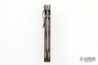 This Gitano by Tom Krein features a clip point 3V multi-ground blade with blackwash finish and dual thumbstuds. The handle is comprised of natural canvas micarta scales over tumble finish titanium liners and backspacer. Titanium tip down pocket clip. Great blade seating, centering and lock up. Comes with a zippered case. Excellent condition.