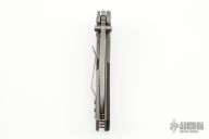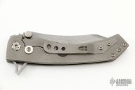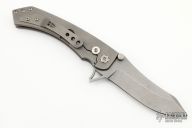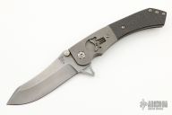 This custom Azrael flipper by Will Zermeno features a stonewashed blade with notched thumbrest and flipper. The handle has a stonewashed titanium dovetailed bolster with punisher skull, lightning strike carbon fiber front scale with tumbled titanium lockside, titanium pocket clip for tip up carry, lockbar stabilizer. Nice lock up and blade seating. Excellent condition. Comes with a zippered case.