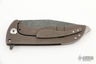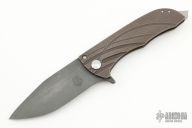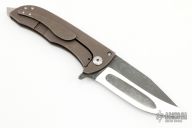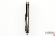 This Splitter Agent from John Gray Knives features a Nitro V Steel chisel ground blade with fullers and a flipper. The handle is comprised of a bark finished and anodized titanium frame with matching tip up clip and orange peel finished titanium backspacer. Nice detent, lockup and blade seating. Excellent condition. Comes with a zippered case.