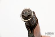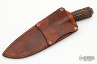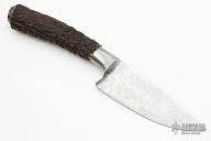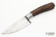 This Knife by Jan Hafinec features a Damascus blade with .200" blade stock and 1.488" blade depth, hidden tang construction. The handle has an integral Damascus guard with a stag grip with a forged/carved bronze butt cap with lanyard hole. Comes with a brown leather sheath. New from maker.