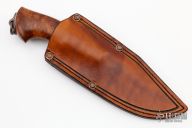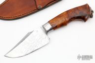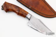 This Knife by Jan Hafinec features a Damascus blade with sharpened top edge, .220" blade stock and 1.766" blade depth, hidden tang construction. The handle has an integral Damascus guard with a desert ironwood burl grip and a bronze butt cap with lanyard bail. Comes with a brown leather sheath. New from maker.