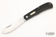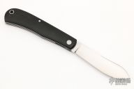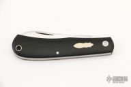 This Slipjoint by Jim Dunlap features a hand rub satin finished blade with nail nick. The handle has black linen micarta covers with ivory paper micarta escutcheon, stainless steel liners and spring. Has half-stop, flush in all positions. Excellent Condition.