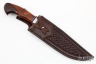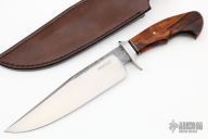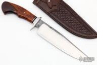 This Camp Knife by Milan Mozolic features a satin finished blade with forge finished flats, .240" blade stock and 1.682" blade depth, hidden tang construction. The handle has a stainless steel guard with black G-10 and stainless steel spacer, desert ironwood grip with a single polished and domed stainless steel pin. Comes with a hand tooled brown leather sheath. Comes with COA. New from maker!