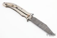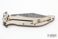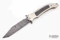 This AXD 5.5 Assisted Framelock Flipper has a Damascus blade, dual thumb studs, and symmetrical flippers. Handle has a satin finished titanium frame with carbon fiber inlay, titanium barrel spacers, and tip up/down reversible stainless steel clip and overtravel stop. Nice action, blade seating and lockup. Comes with zippered case. Excellent condition.