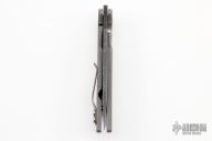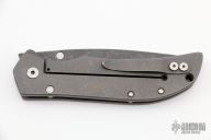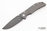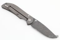 This framelock folder by Jeremy Robertson features a heavy stonewashed finish drop point convex grount blade with notched thumbrest and single thumbstud. The handle has a tumble finished titanium frame with matching tip up clip. Nice detent, blade seating and lockup. Excellent condition. Comes with a zippered case.