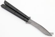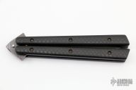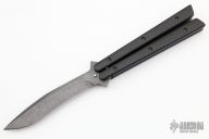 This Balisong by Jim Burke features a dark tumble finished recurve blade with false top edge. The handle has carbon fiber scales, anodized and tumbled titanium liners. Rides on bearings, very smooth. Comes with a Velcro case. Excellent condition.