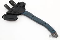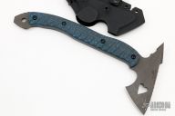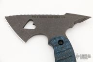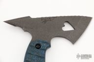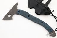 This Bleeding Heart Tomahawk by Half Face Blades features a 2.5" blade with spike at the rear, .233" blade stock, full tang construction. The handle has polar plunge carbon fiber scales. Comes with a kydex sheath. Excellent condition.