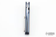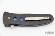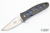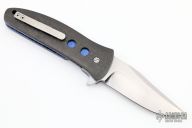 This knife by Mel Pardue features a hand rub satin finished drop point blade with flipper. The handle has carbon fiber scales, anodized and jeweled titanium liners, carbon fiber backspacer, tip up titanium clip. Comes with a zippered case. Excellent condition.