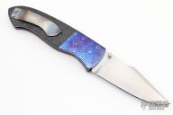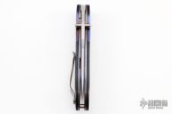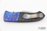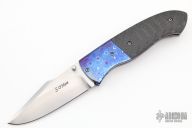This gorgeous linerlock folder by Sean O'Hare features a hand rub satin finished blade with dual thumbstuds. The handle has Raindrop pattern timascus bolsters, a titanium clip, and carbon fiber scales. Titanium liners/clip are anodized and orange peel finished. Nice detent lockup and blade seating. Comes in a zippered case. Excellent condition.