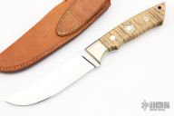 This knife by Corbit Sigman features a mirror polished drop point blade, .194" blade stock and 1.084" blade depth, full tapered tang construction. The handle has dovetailed nickel silver bolsters and curly maple scales. Includes a brown leather sheath.  Excellent condition.