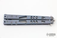 This Tachyon II balisong by Marfione Custom Knives has a two-tone clip point blade. The handle has skeletonized, tumbled and anodized titanium handles with T-latch. Includes a Velcro case. Excellent condition.
