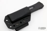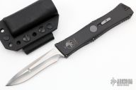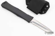 This Combat Talon II by Microtech features a hand rub satin finished plain edge blade, hand-ground and finished by Walter Brend. Push button automatic opening. Closes via a reverse charging handle in the rear of the frame. Contoured aluminum frame with milled ribbing on the frame spine and belly. Serial #137 and dated 2/2000. Comes with original box, papers, and kydex sheath. Has a couple extremely light snail trails, almost hate to even mention them, probably one of the cleanest ones I have seen, Excellent condition.