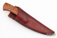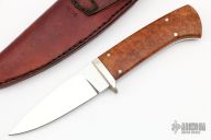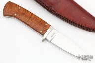 This knife by Charles Weiss features a mirror polished blade with .191" blade stock and 1.091" blade depth, full tapered tang construction. The handle has a nickel silver guard, wood scales with black liners. Comes with a brown leather sheath. Excellent Condition.