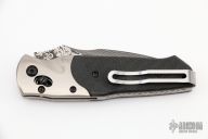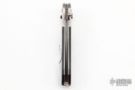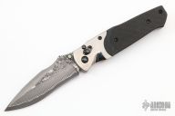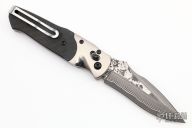 This Arcitech by SOG Knives features a San Mai Damascus drop point blade with swedge, notched thumb rest and single thumb stud with inlay. The handle is comprised of titanium bolsters and carbon fiber scales over titanium liners and fileworked titanium backspacer. Stainless steel tip up clip. Excellent condition.