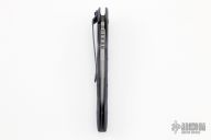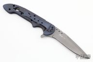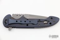 This Perfigo Prototype #00 by Crawford Knives features a bead blasted blade with swedge and flipper. The handle has a bead blasted and anodized titanium frame with a matching tip down clip and a blasted stainless steel backspacer. Nice detent, blade seating and lockup. Excellent condition.