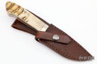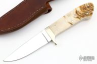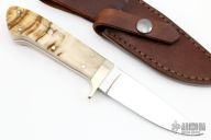 This knife by Jim Ort features a mirror polished drop point blade with a tapered tang construction.  .209" Blade Stock.  1.054" Blade Depth.  The handle features a nickel silver guard with rams horn scales.  Includes a brown leather sheath.  There is a little patina on the guard otherwise the knife is in excellent Condition.