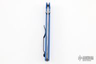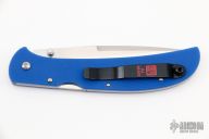 This Eagle Heavy Duty lock back by Al Mar Knives has a satin finished San Mai blade with dual thumb studs. Blue G-10 scales and a black stainless steel pocket clip, left or right reversible. Strong lock up. Comes with original box. Excellent condition. This knife was a limited edition and a Cutlery Shoppe Exclusive.