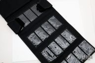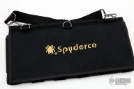 Eighteen-pocket SpyderPac is an impressive and safe way to carry and display your knife collection. It's half the size of the large SpyderPac and fits neatly in a suitcase or portfolio. Each pocket is 4-1/2" X 2-1/2" (114mm X 63.5mm). Measures 15.5" x 7.5" overall closed. Constructed from heavy-denier polyester Cordura, the pack has eighteen deep pockets sized to hold even larger folders. Each pocket is fronted with a clear plastic window for viewing knives tucked inside. It tri-folds over and seals closed by way of a Velcro strip running the width of the pack. The knives remain secure and separated in their pockets and cannot rub or scratch against each other. An adjustable length shoulder strap attaches with two durable steel D-rings letting you hang the pack for display on a wall or sling it over your shoulder to take with you. Spyderco's name and bug logo are embroidered in gold thread on the closing flap. Excellent condition.