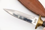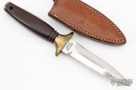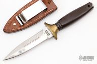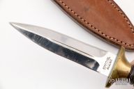 This Vintage Kai Japan Special Agent Dagger/Boot Knife has a mirror polished stainless steel D/E blade with fullers and hidden tang. .194" blade stock, .875" width. Handle is "cat tongue" finished brown aluminum with brass double guard and lanyard hole.  Comes with Kershaw box and brown leather slip sheath with button closure and stainless steel clip. Has chips, scuffs and scratches. Has been resharpened. Fair condition.