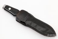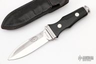 This is a very attractive boot knife from AG Russell. This is the older model made in Solingen, Germany. Blade is .099" thick and .908" deep at the ricasso and double-edged. Scales are black linen micarta. Integral construction with aluminum pins. Comes with a black leather sheath. Has some light scratches, otherwise good condition.