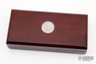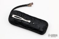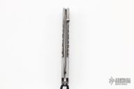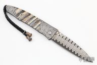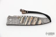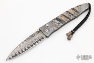 This GenTac button lock folder from William Henry features a Wave San Mai Damascus blade with a ZDP-189 core, single thumbstud with diamond inlay in a gold bezel. The handle has a Mike Norris Carbon Ladder Damascus frame with fossil mammoth tooth inlays. Diamond insets in thumb stud and push button. Includes pocket sheath with clip,original box and COA. Excellent condition.