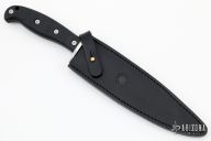 - Item includes a handcrafted leather sheath with a belt loop, brass frog stud, and retaining strap.