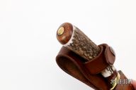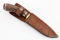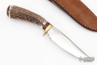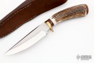 This Hunter by Jim Gill features a mirror polished convex ground blade with .171" blade stock and 1.17" blade depth, hidden tang construction. The handle has a brass guard, stag grip with brown micarta spacers/butt cap. Comes with a brown leather sheath.  Excellent Condition.