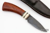 This Hunter by Jonathan Wick features a Damascus drop point blade with a hidden tang construction.  .135" Blade Stock.  .984" Blade Depth.  The handle features a copper, walrus and wood grip.  Includes a brown leather sheath.  Excellent Condition.